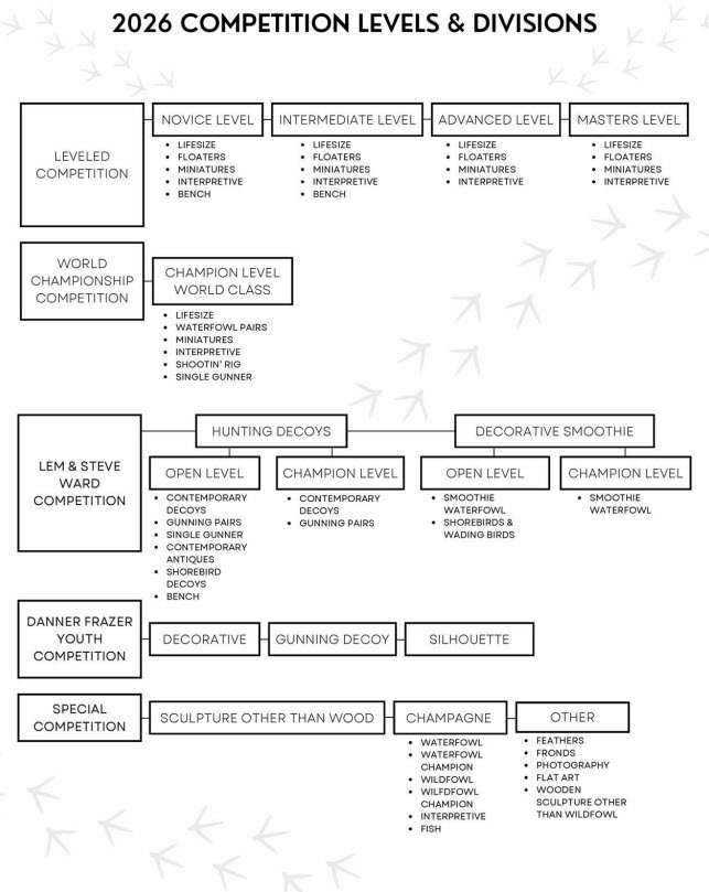 This level is reserved for entry-level carvers. Novice carvers compete for ribbons, rosettes and Best in Show cash awards. Carvers who have won one Best in Show or two Best in Division (excluding Bench) awards at this level in the World Competition must move to the Intermediate level. Carvers who have been consistent blue ribbon winners at this level are encouraged to move up to Intermediate.